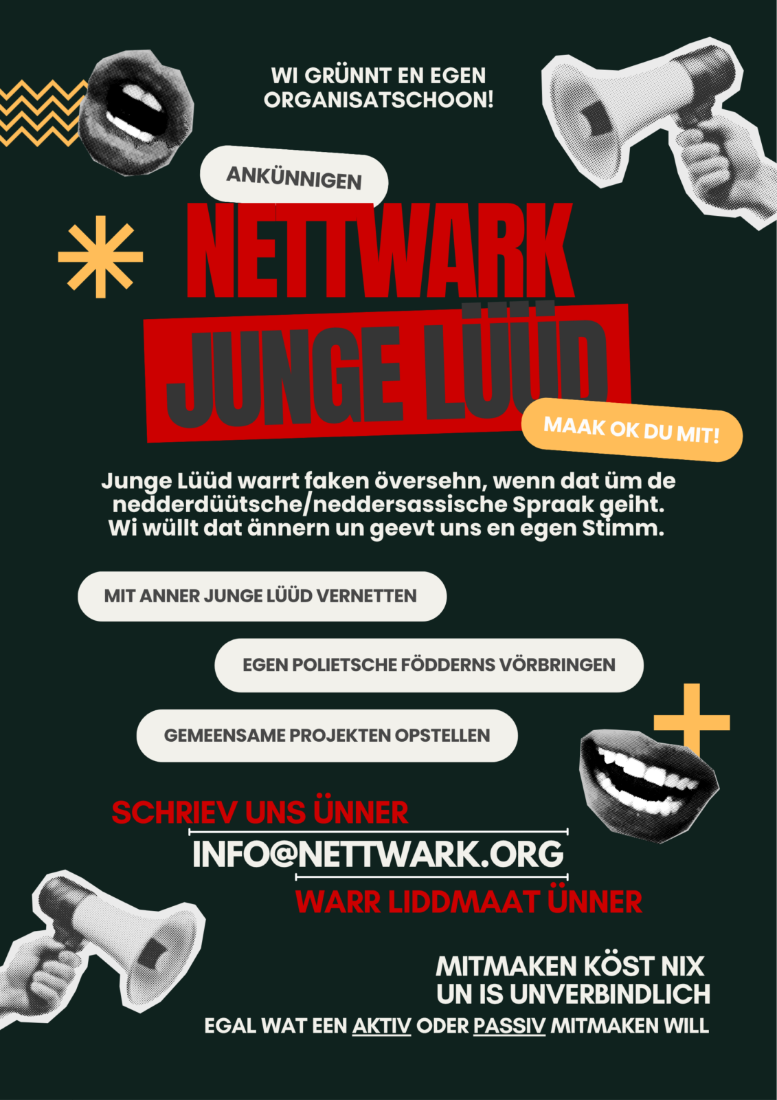 Junge Sprecherinnen und Sprecher des Niederdeutschen organisieren sich: Mit dem Nettwark Junge Lüüd (NJL) entsteht derzeit eine neue Organisation, die jungen Menschen aus der niederdeutschen/niedersassischen Sprachgemeinschaft erstmals eine eigene, gemeinsame Stimme geben soll. Die offizielle Gründung ist für Mai/Juni 2026 vorgesehen.