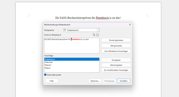 Am 15. April 2026 hat die SASS-Redaktion eine Rechtschreibprüfung für das Plattdeutsche (Niederdeutsche) online gestellt. Diese Rechtschreibprüfung ist eine Ergänzung zum frei erhältlichen Textverarbeitungsprogramm LibreOffice. Sie kann kostenlos auf der Internetseite des SASS-Netzwörterbuchs heruntergeladen werden (https://netz.sass-platt.de/) und auch als Ergänzung zu anderen Textverarbeitungsprogrammen wie Microsoft Word genutzt werden.
